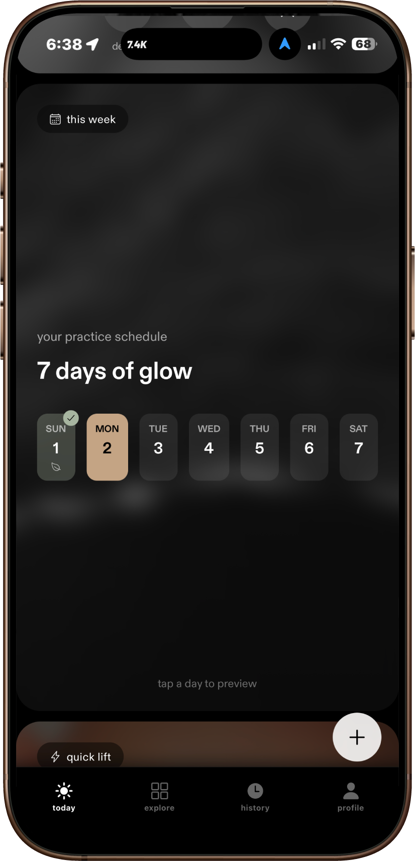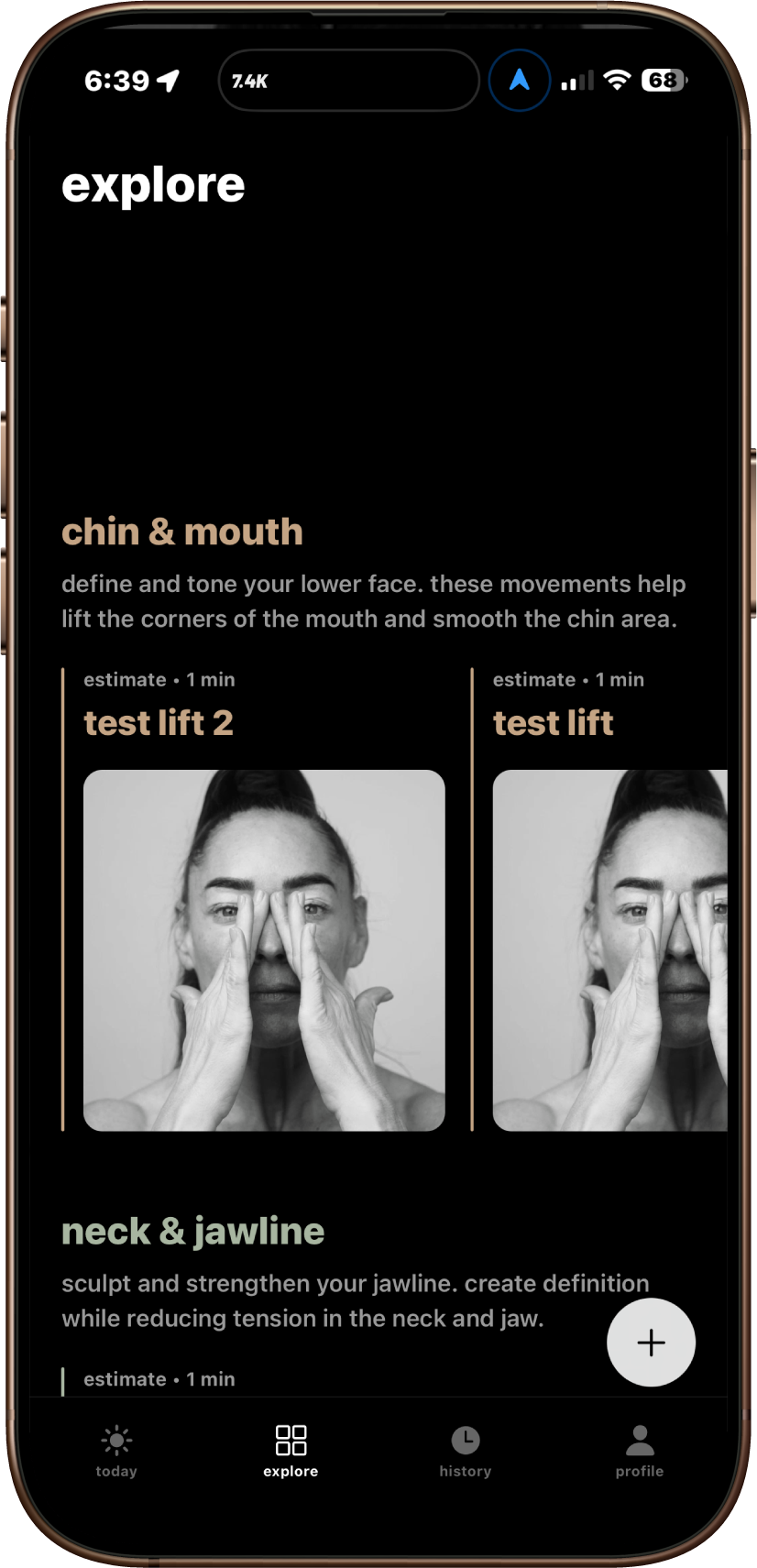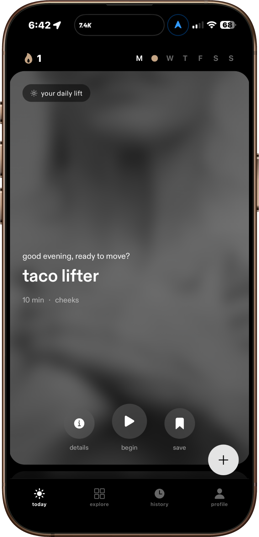 The Daily Lift is your daily facial exercise session — a guided routine combining Tone, Sculpt, and Lift phases. Each day brings a fresh workout so your practice never feels repetitive.